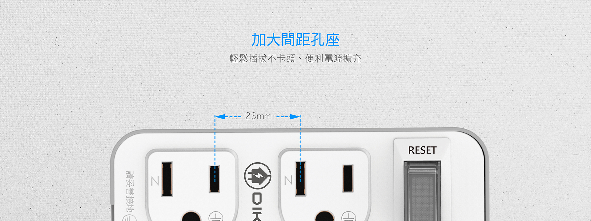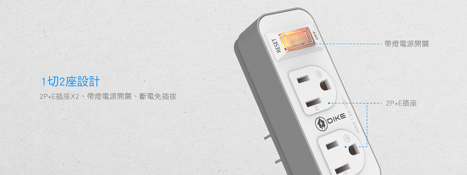 一切兩座電源擴充。BSMI新版安規認證,多重安全防護、過載自動斷電。複合式帶燈開關,一鍵斷電、避免重複插拔造成插座損毀
