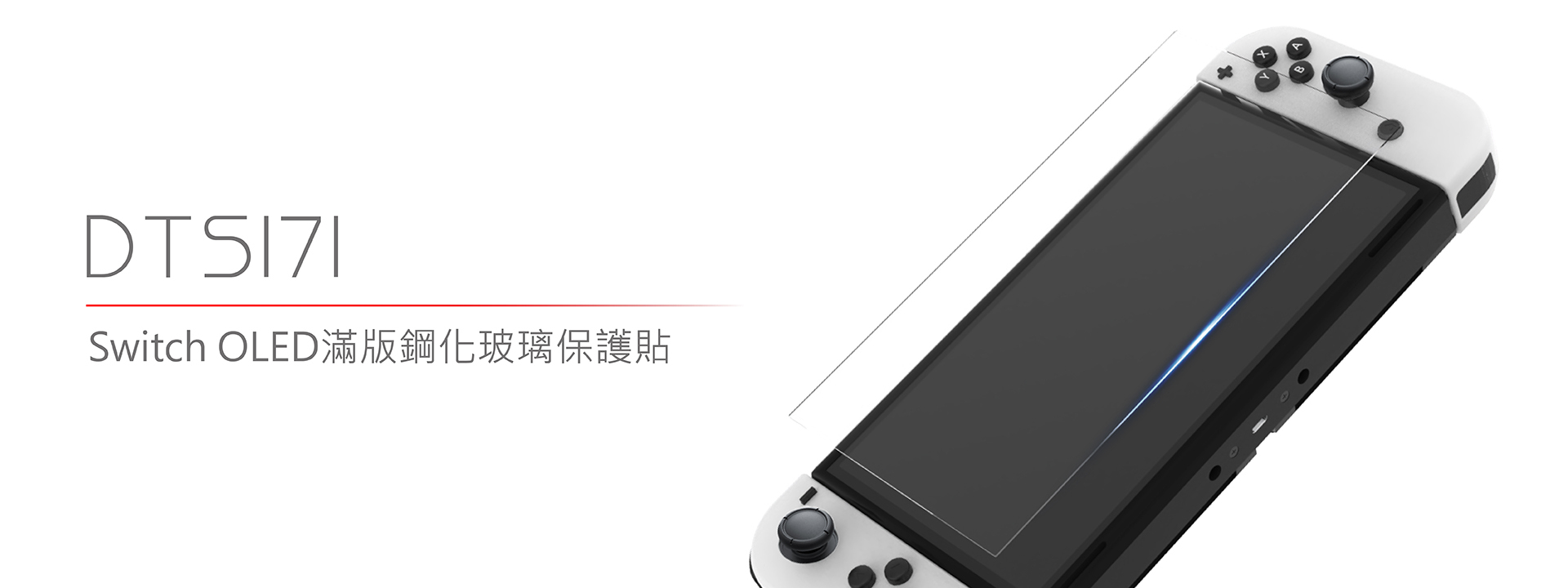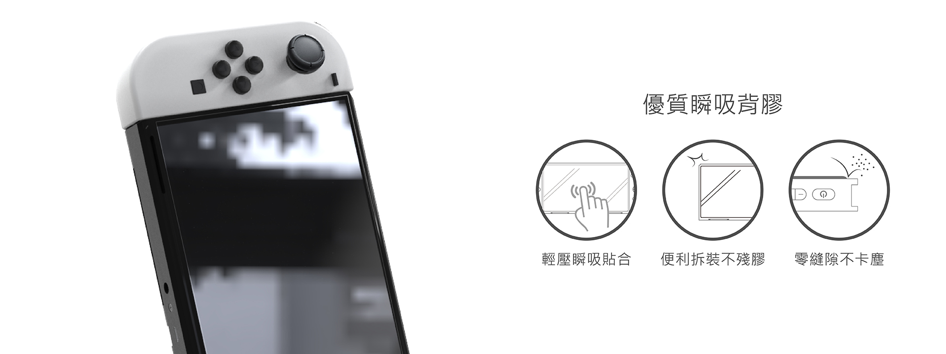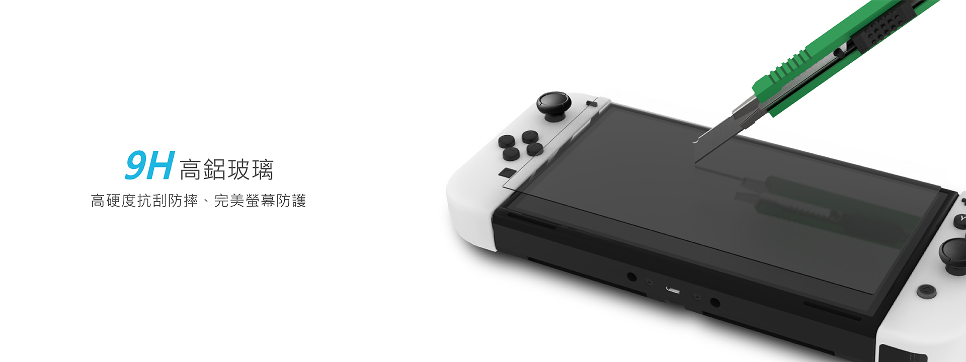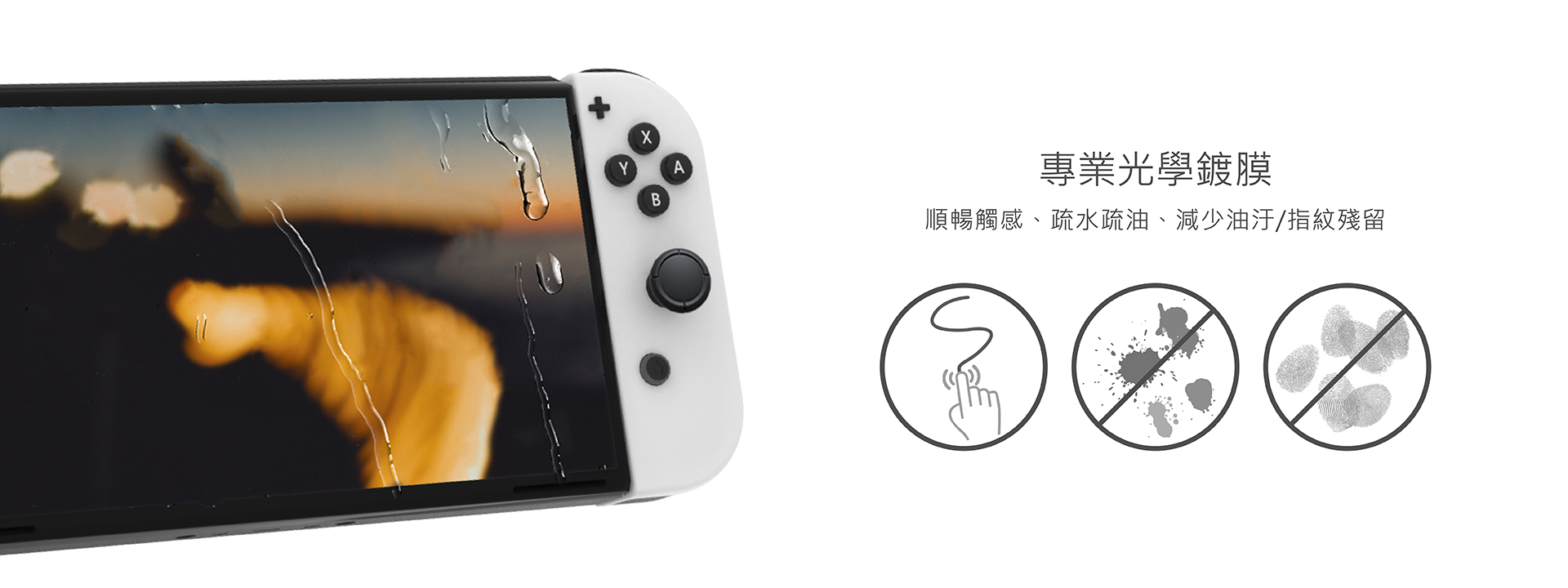 Switch OLED 專用螢幕保護貼。全螢幕滿版設計,疏水疏油塗層,高透光滑順觸感,9H高鋁玻璃,防爆膜結構安全強化,高規格全面防護。