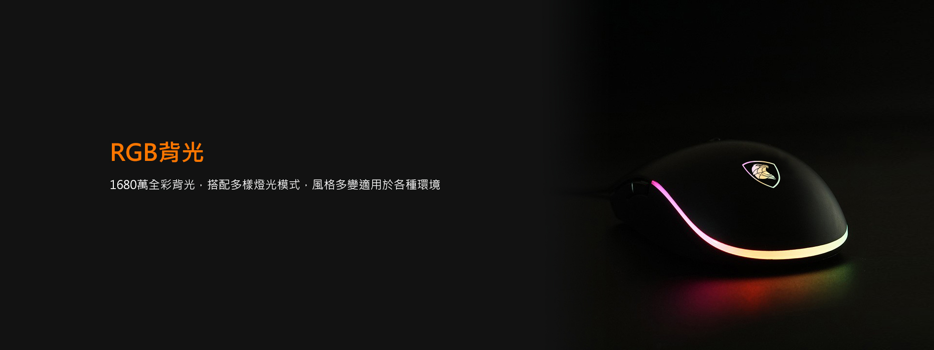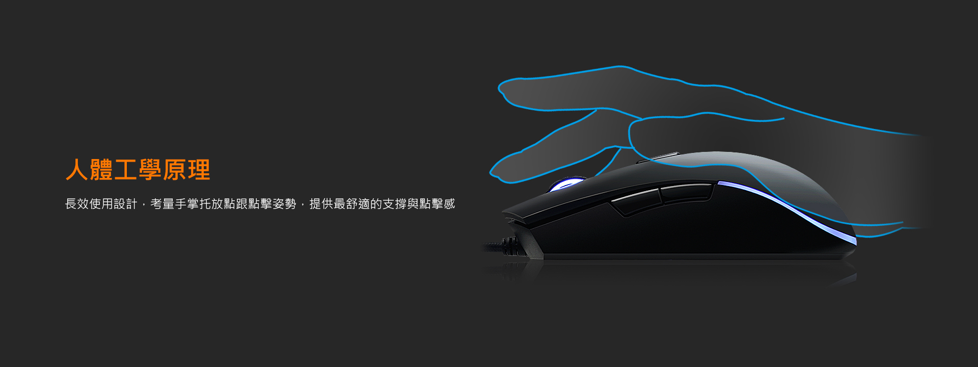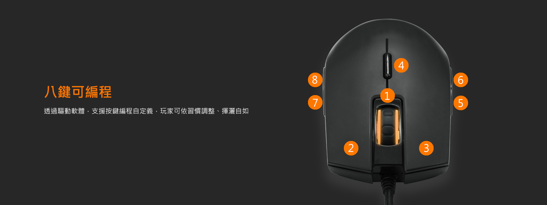 對稱外型,滿足各派電玩高手,1680萬RGB全彩背光,點燃競技的戰火。搭配最高4000DPI光學引擎及8鍵可編程自定義按鍵,讓你隨心所欲、招招克敵。