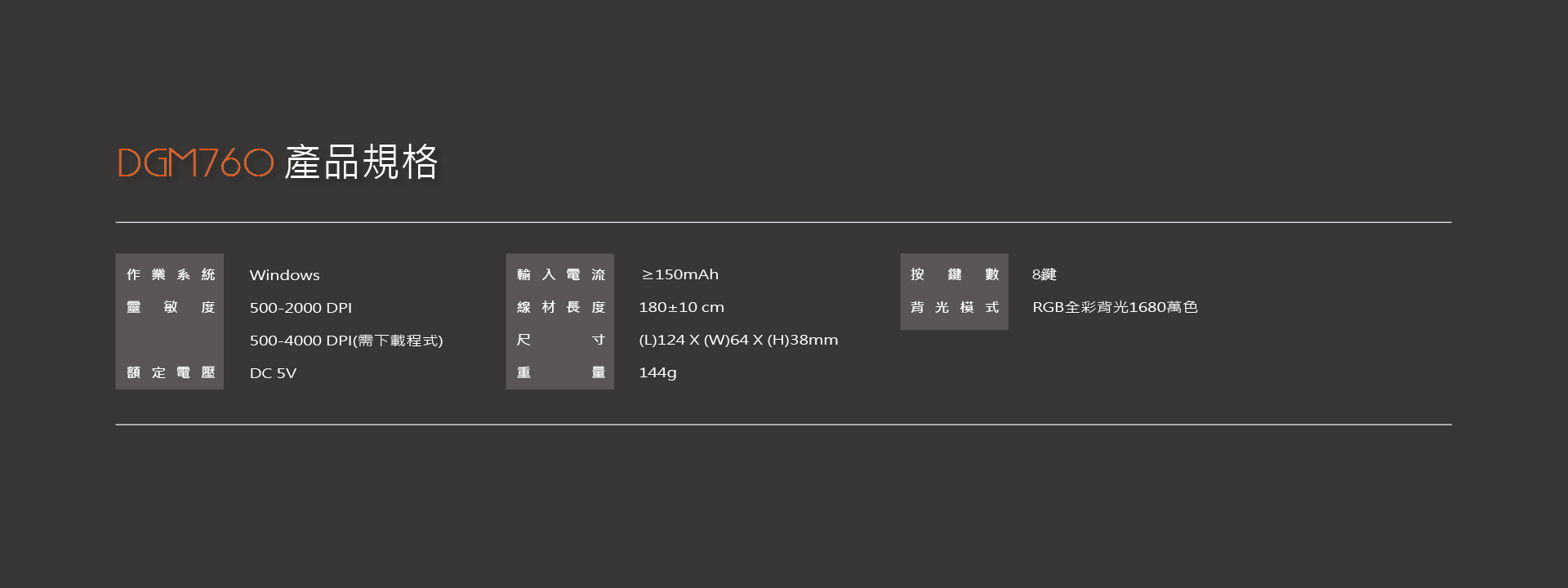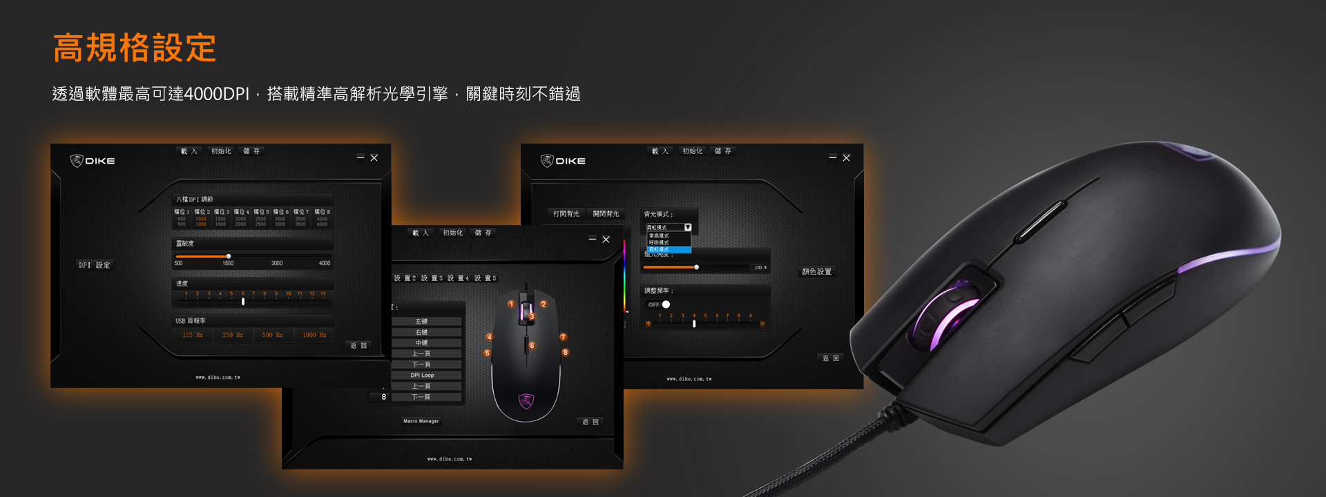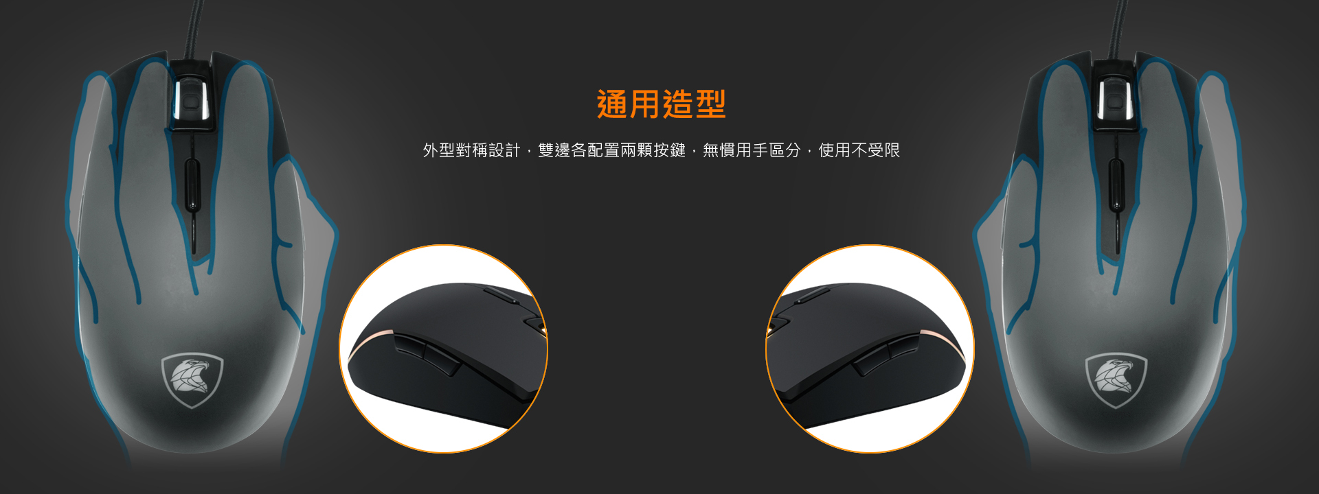 對稱外型,滿足各派電玩高手,1680萬RGB全彩背光,點燃競技的戰火。搭配最高4000DPI光學引擎及8鍵可編程自定義按鍵,讓你隨心所欲、招招克敵。