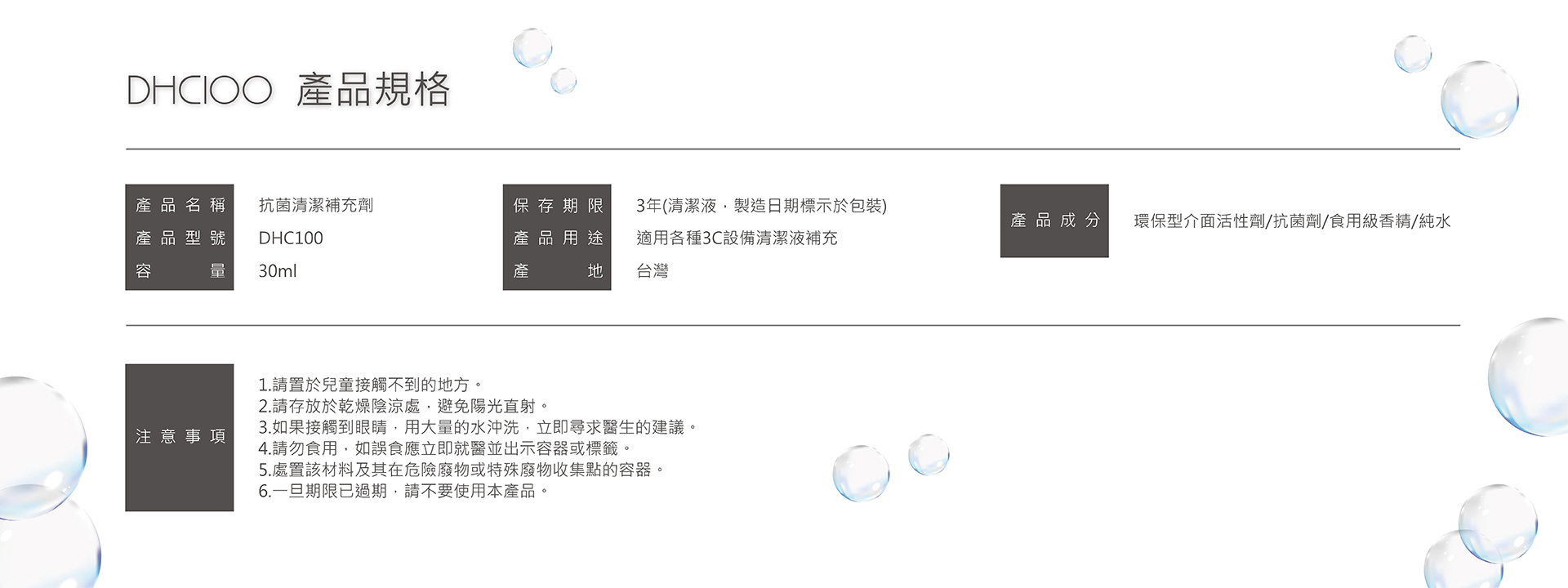 輕巧補充瓶,SGS檢驗合格、MIT台灣製造、99.9%有效抗菌,不含阿摩尼亞、無酒精刺激,適合各式3C產品與螢幕清潔使用。
