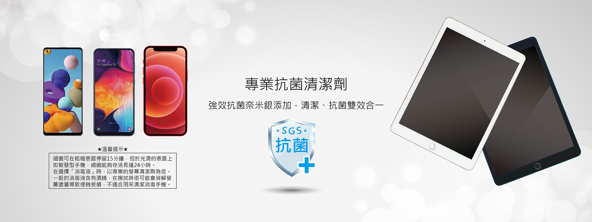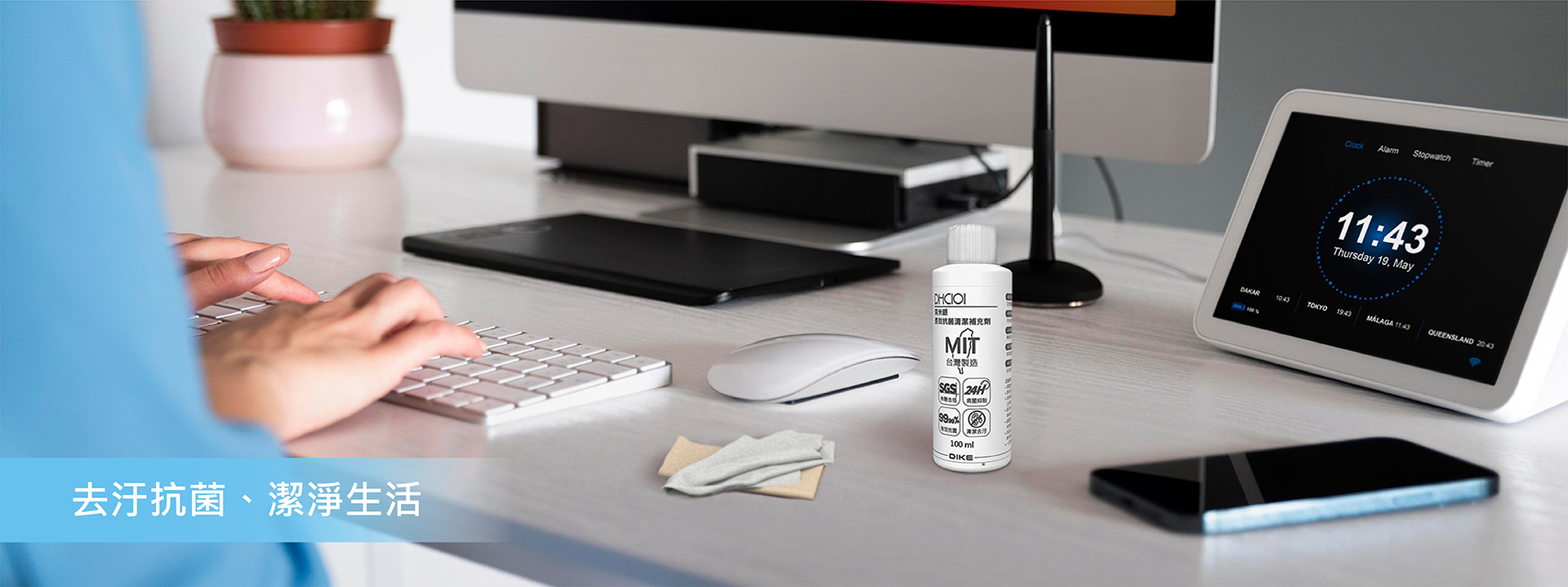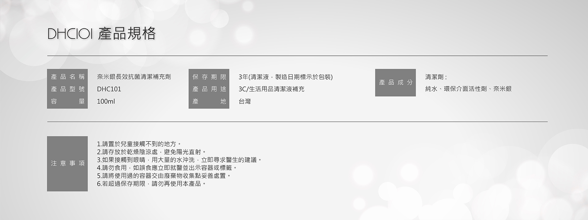 大容量100ml補充瓶,SGS檢驗合格、MIT台灣製造、奈米銀離子24H長時間、99.9%有效抗菌,溫和無味不刺激,適合各式3C產品與螢幕清潔使用。