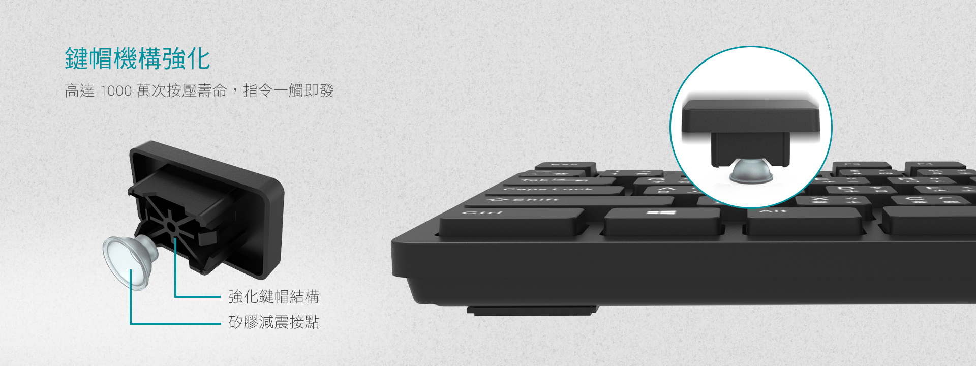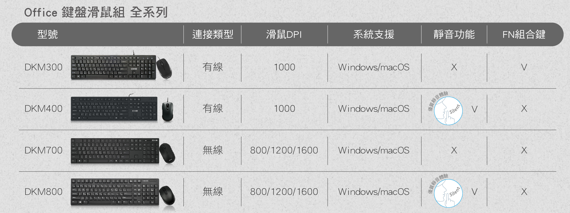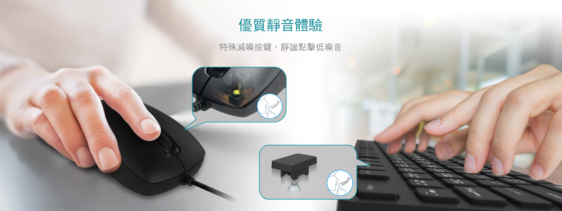 特殊降噪按鍵設計,最佳靜音辦公組合。雙手通用高解析光學滑鼠,減壓式金屬墊片結構強化鍵盤,順暢俐落手感、優質點擊體驗。