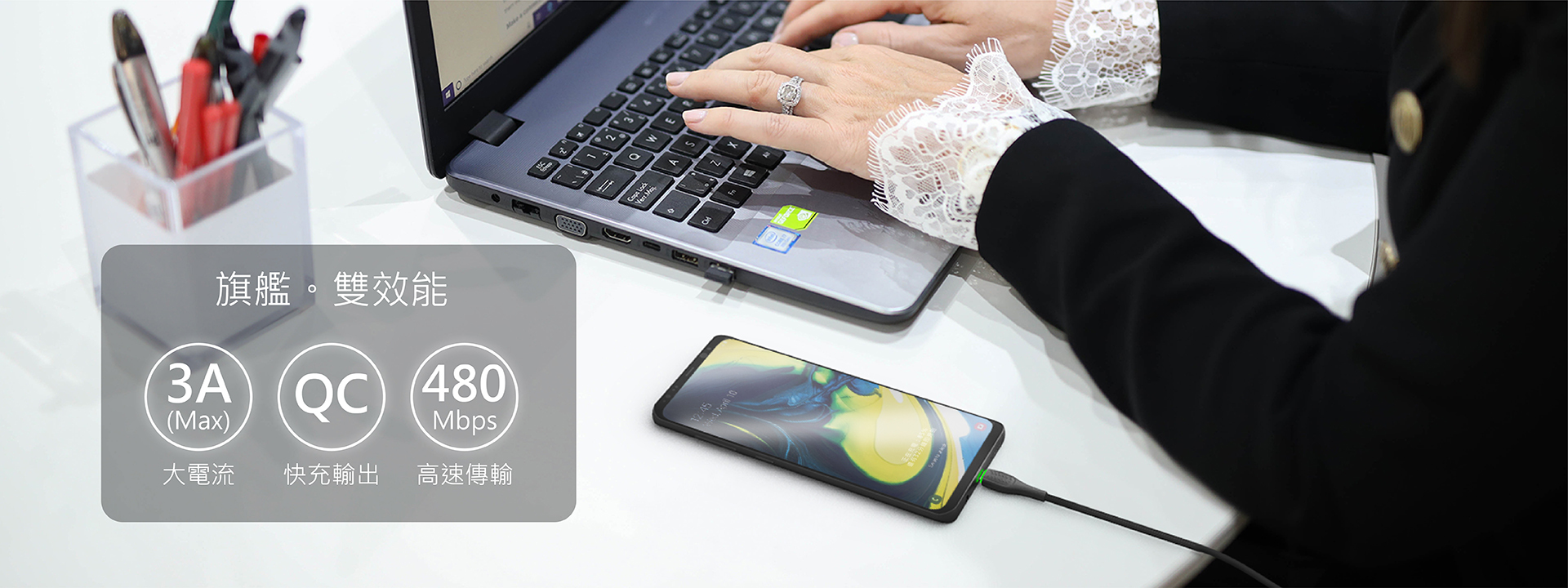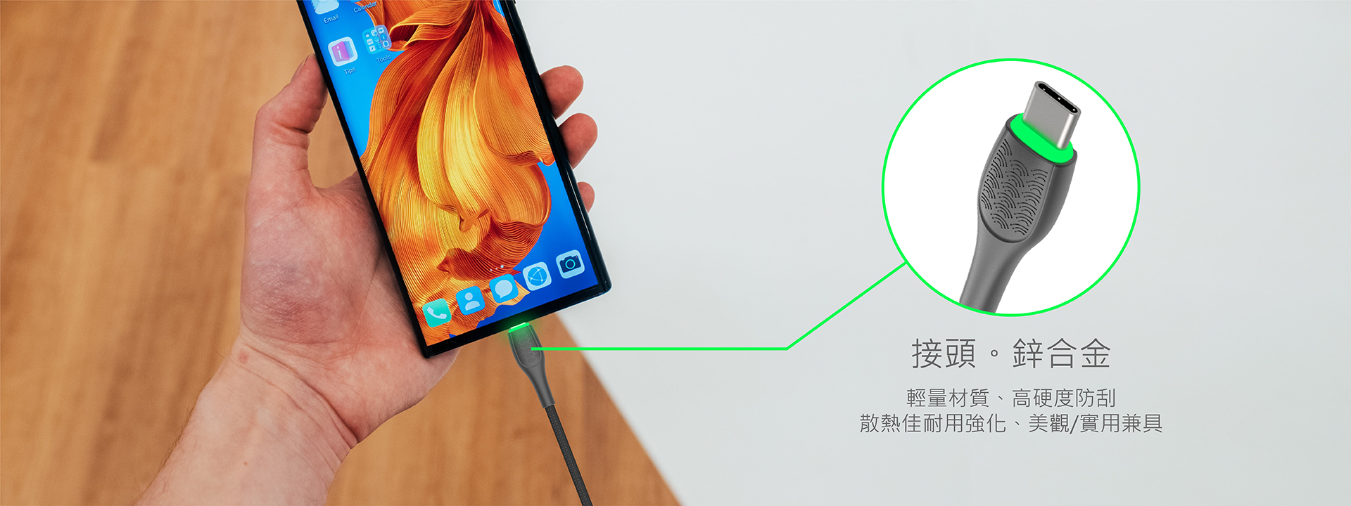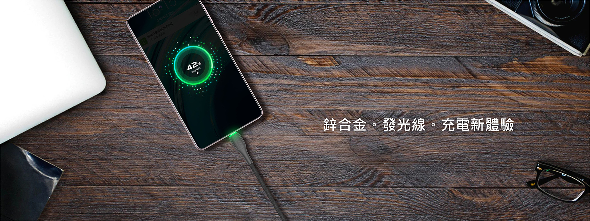 質感鋅合金、Type C發光接頭設計,便利設備尋找。高純度銅導線,2款長度可選,完美支援快速充電與高速傳輸。