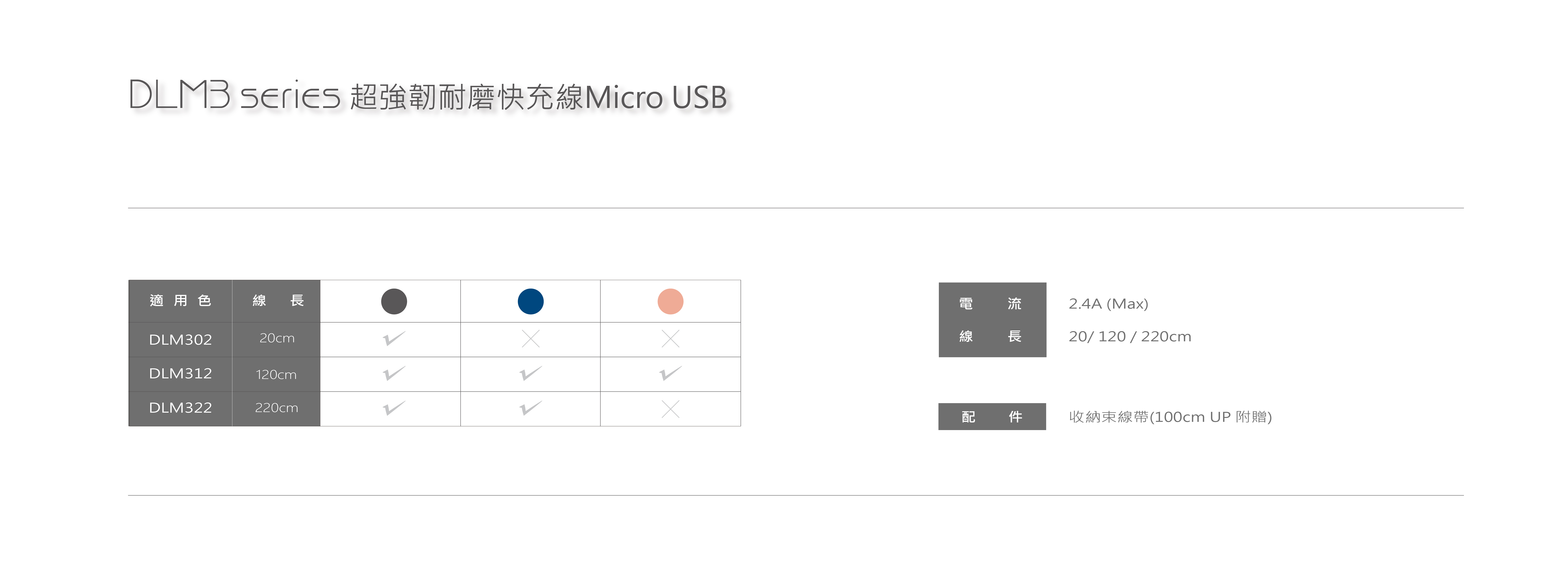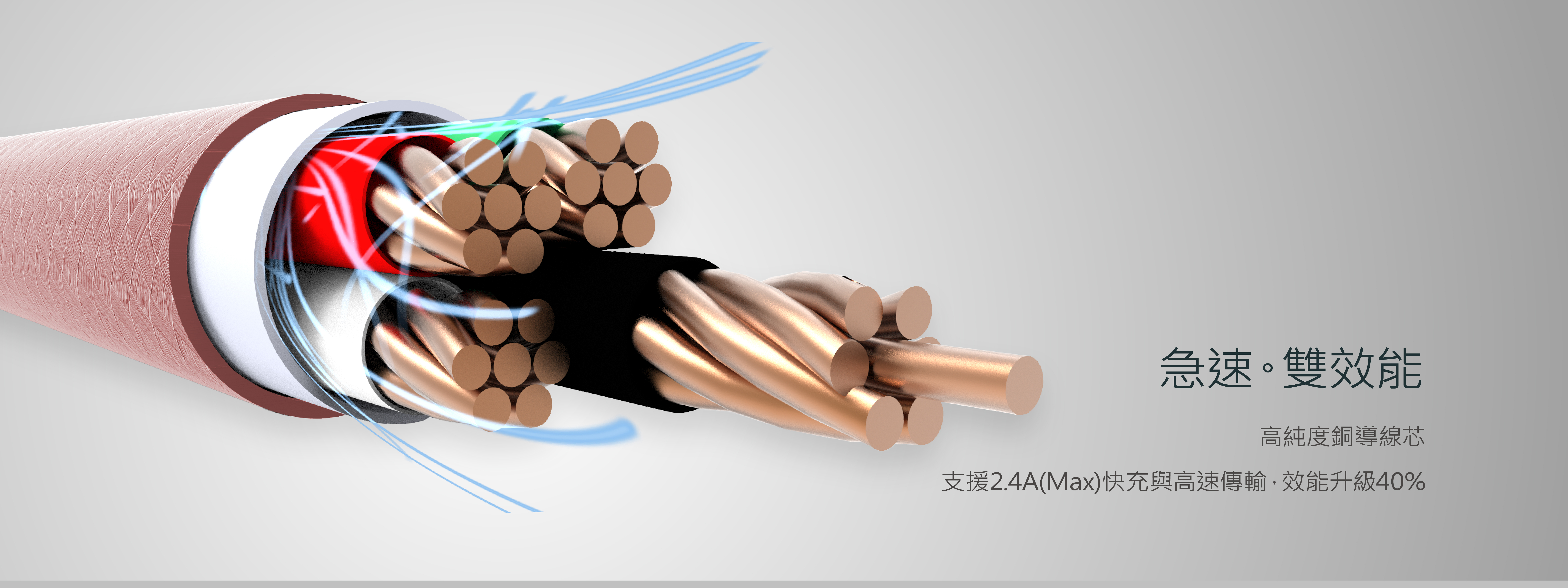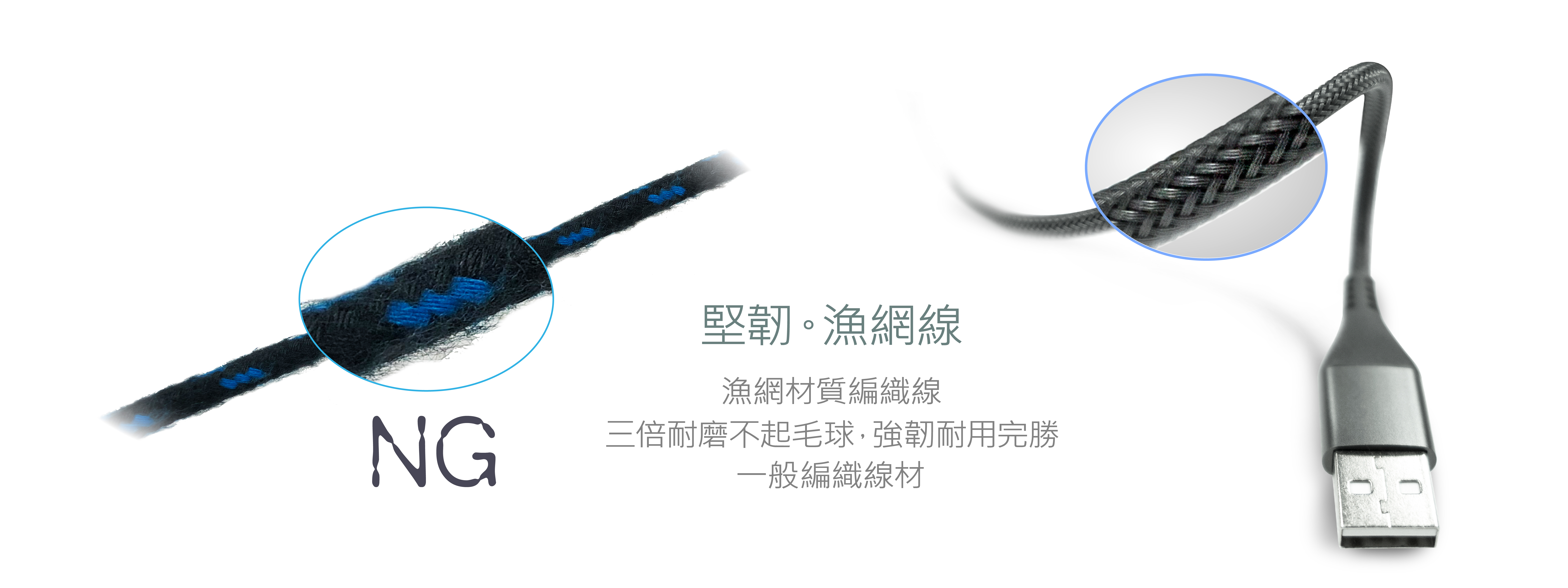 Micro USB接頭專用,精緻漁網編織線/雙接頭SR強化,7倍強韌耐用。高純度銅導線,3款長度可選,完美支援2.4A(Max)快充與高速傳輸
