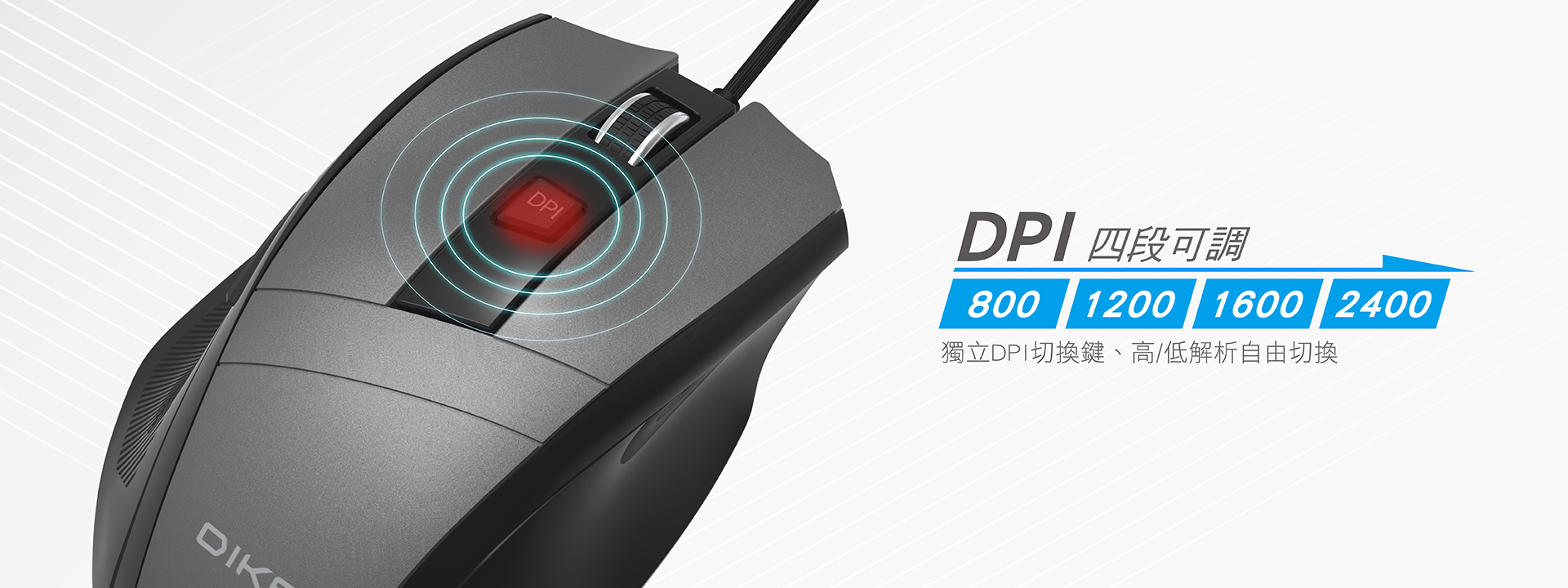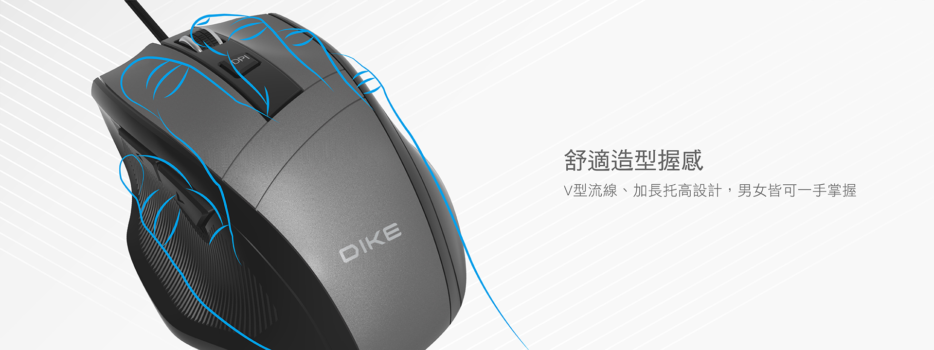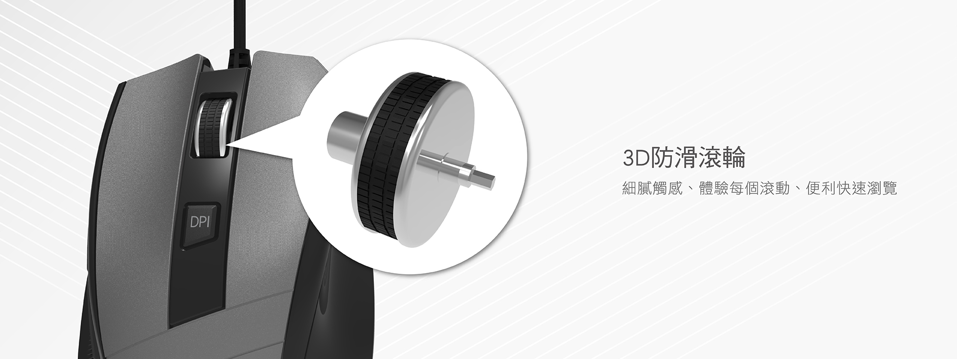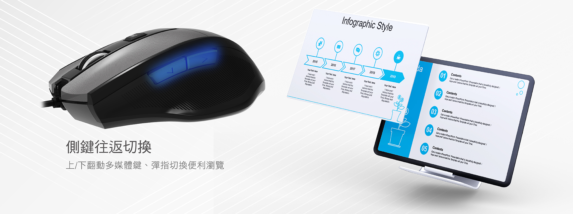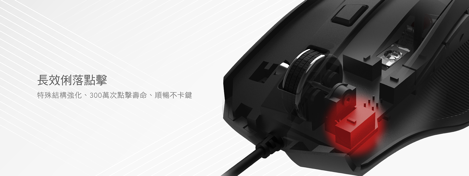 四段可調DPI、高解析光學感應器,定位靈敏精準。酷炫外型配置上下切換側鍵,瀏覽往返迅速便利。加高貼合掌心、流線防滑凹槽,輕鬆掌握不疲勞