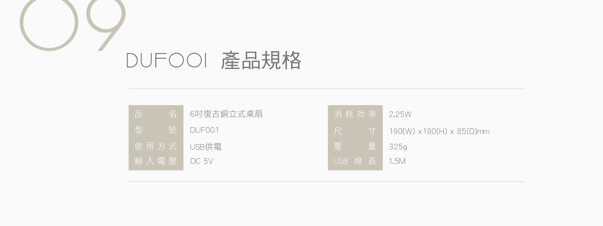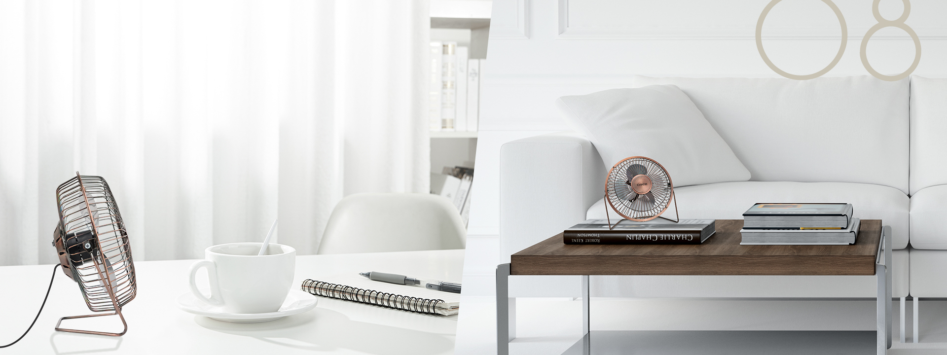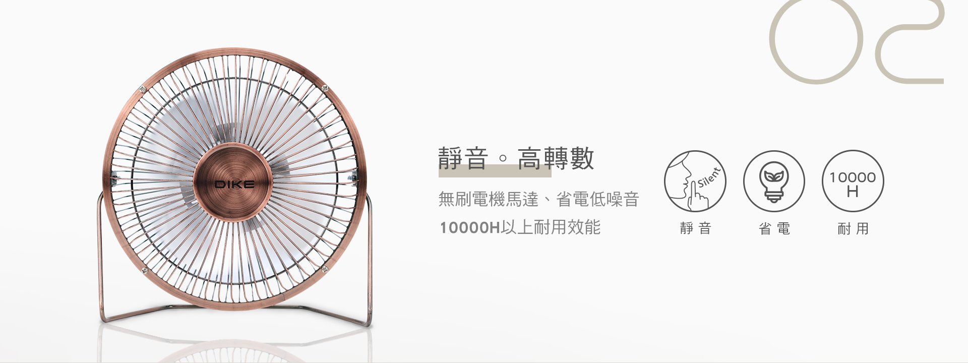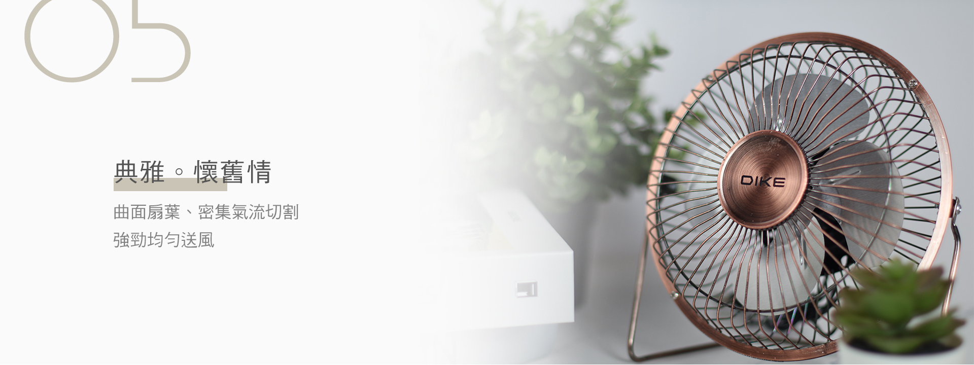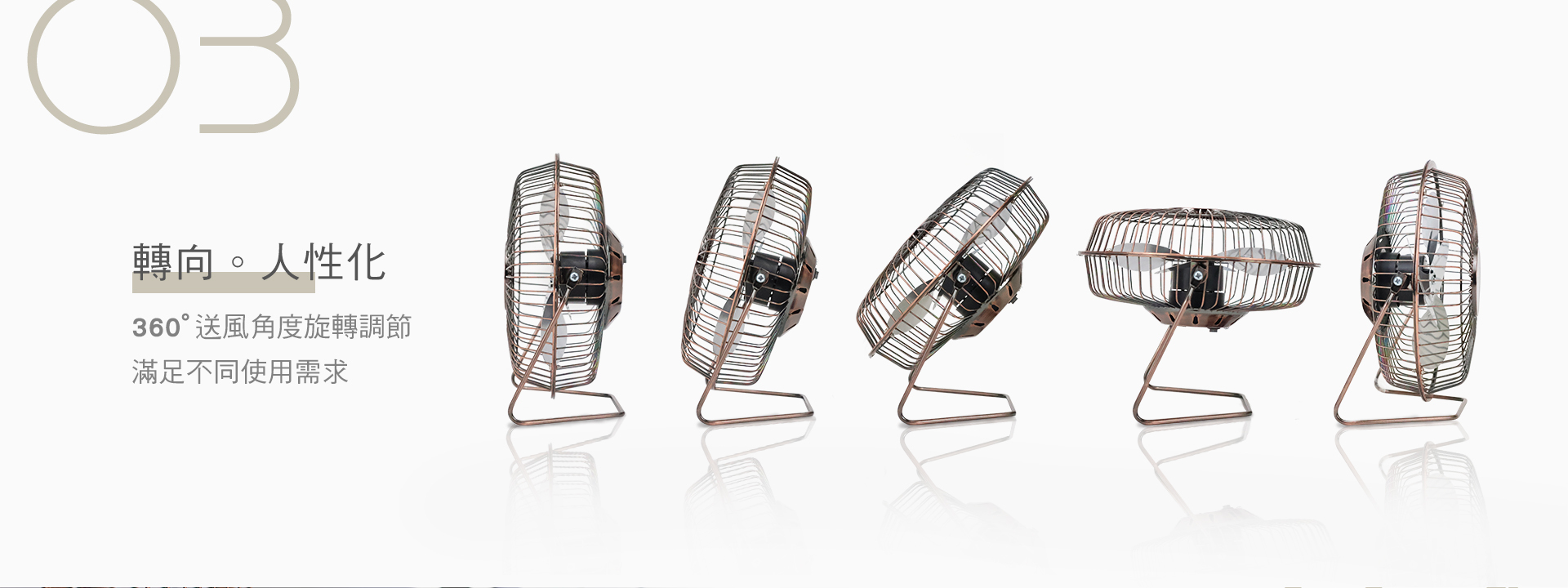復古銅立式桌扇,鋁質曲面扇葉、均勻送風;無刷電機馬達、省電低噪音,USB供電,使用便利;古銅金屬機身、精緻匠鑄工藝,生活品味與實用兼具