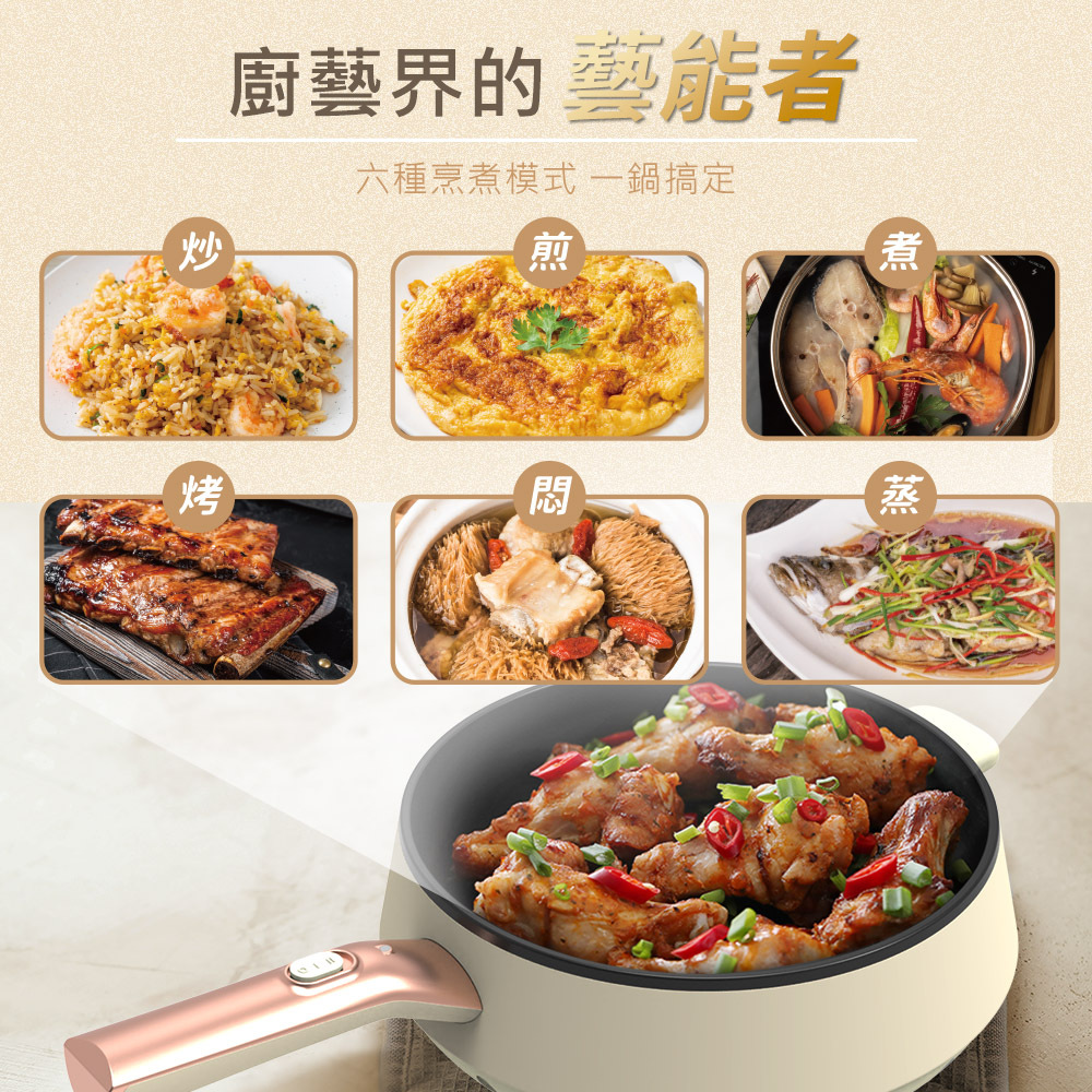六種烹煮模式 一鍋搞定,1200W大火力 ,二段火力調節 ,一鍋多用下廚免顧火,輕鬆煎烤不費力,插電即用好方便