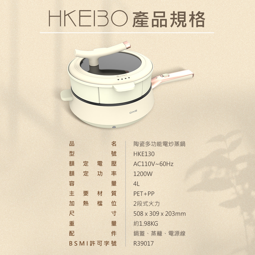 HKE130 4L陶瓷多功能電炒蒸鍋