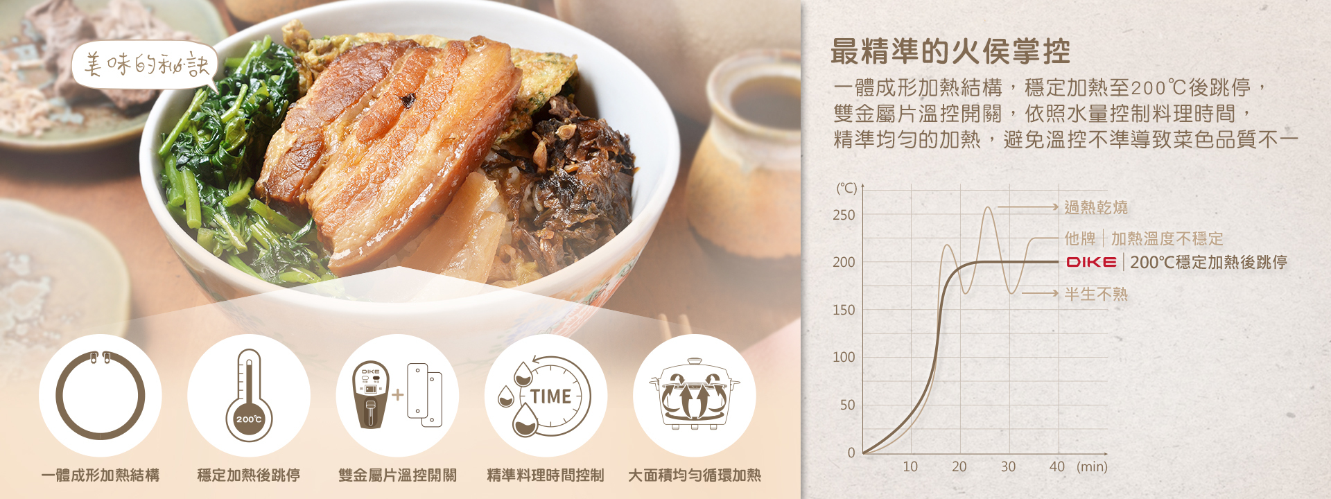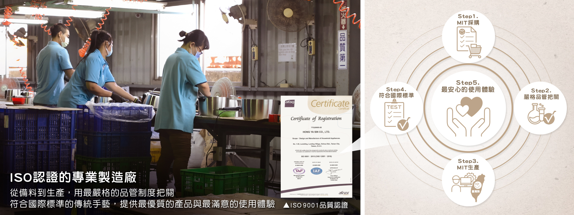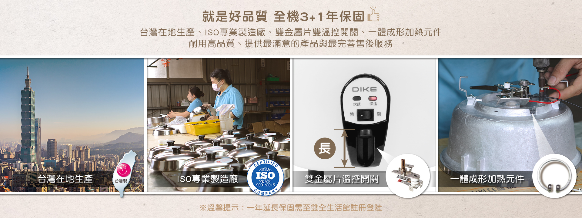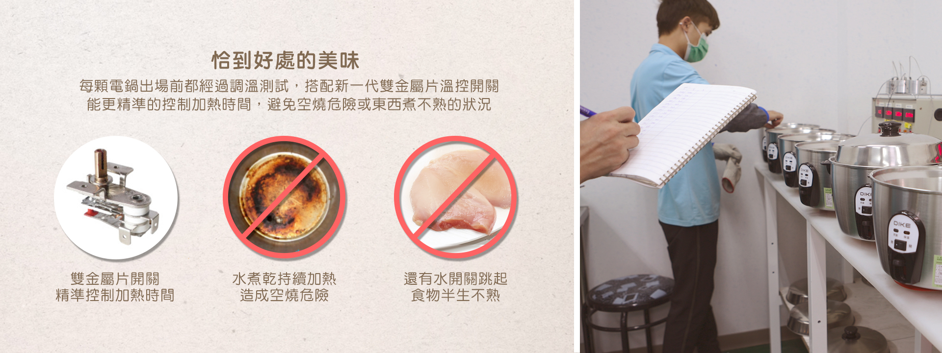 100% MIT台灣生產製造,新一代雙金屬片溫控開關+一體成形加熱元件,出廠前每顆電鍋都經過嚴格的溫控測試與品管檢驗,確保食物呈現最美味的樣貌