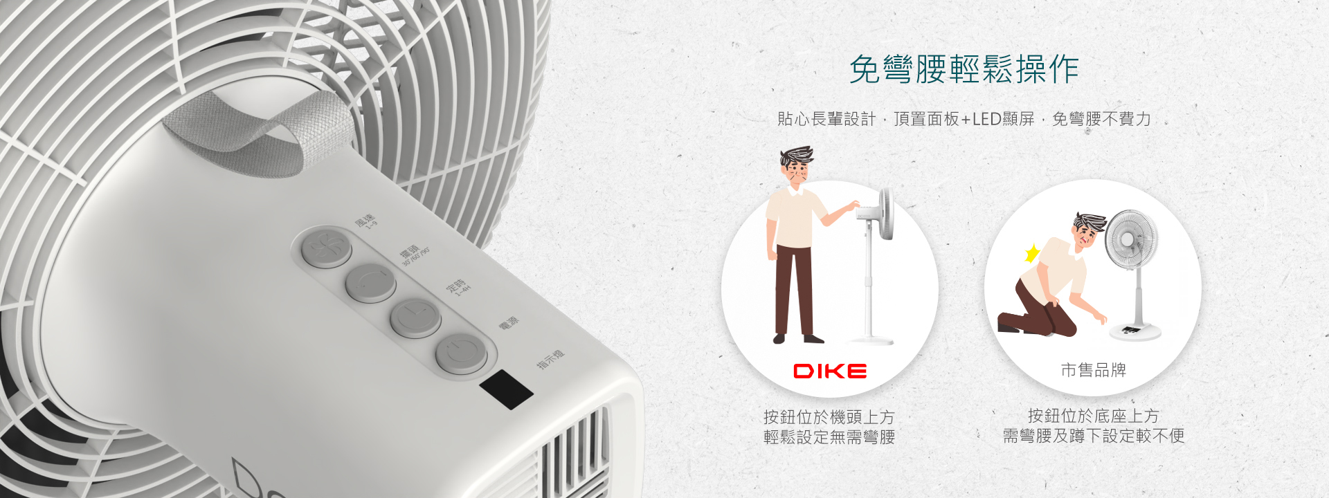 扇頭配置操作面板,免彎腰輕鬆操作,高轉數磁浮電機,強勁送風降溫。9段風速、3段擺頭、1~8H定時、高低可調整,專注細節滿足使用體驗